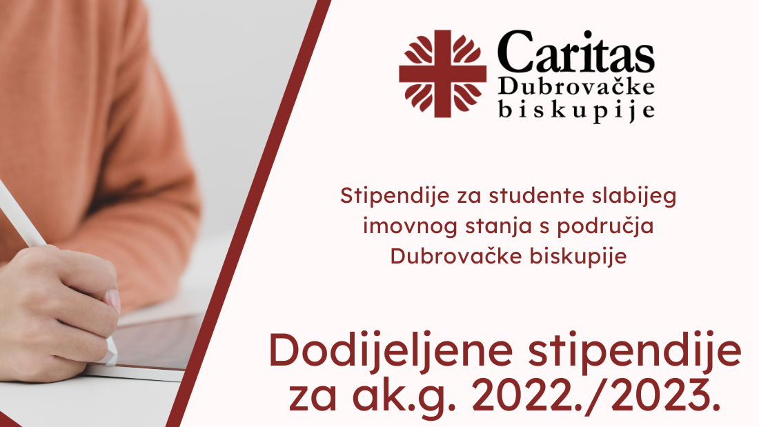 Odlukom Povjerenstva za dodjelu stipendija Caritasa Dubrovačke biskupije od 2022. godine, dodijeljeno je 20 stipendija studentima slabijeg imovnog stanja s područja Dubrovačke biskupije. Stipendije se isplaćuju u mjesečnom iznosu od 1.500 kn, u deset mjesečnih obroka tijekom natječajne akademske godine.