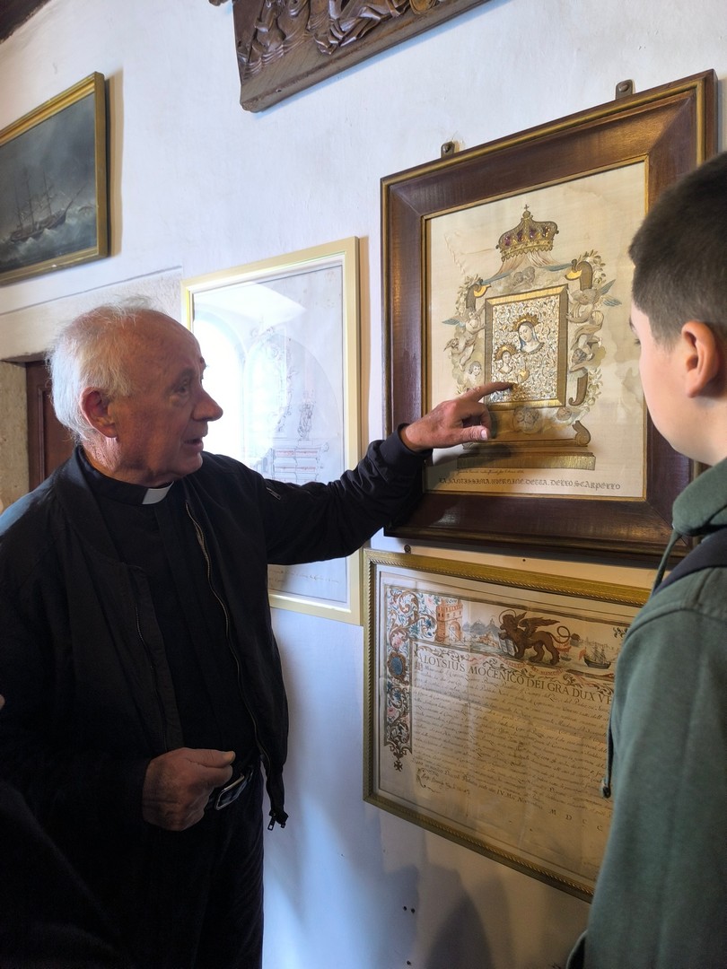 Na otočiću Gospe od Škrpjela sudionici izleta susreli su i dugogodišnjeg župnika u Perastu don Srećka Majića koji im je također govorio o povijesti i znamenitostima koje se nalaze na otočiću.