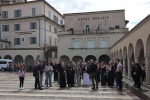 Svoje su hodočašće započeli u Asizu, u bazilici Gospe od Anđela, gdje su mogli vidjeti mjesto na kojem je sveti Franjo Asiški preminuo i prešao u raj. U toj su bazilici slavili misu u jednoj od kapelica. Potom su posjetili baziliku svetog Franje, bogatu znakovitom umjetnošću i alegorijama. Naposljetku su ušli i u crkvu u kojoj se nalazi neraspadnuto tijelo svetog Carla Acutisa, iskazujući mu dužno poštovanje.