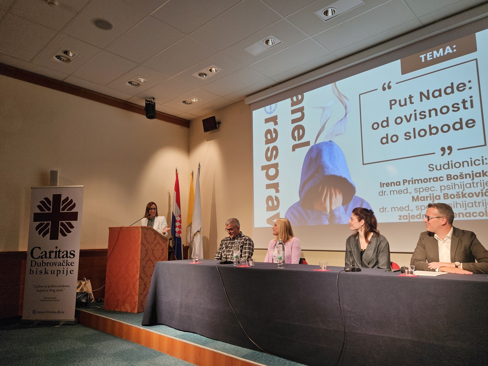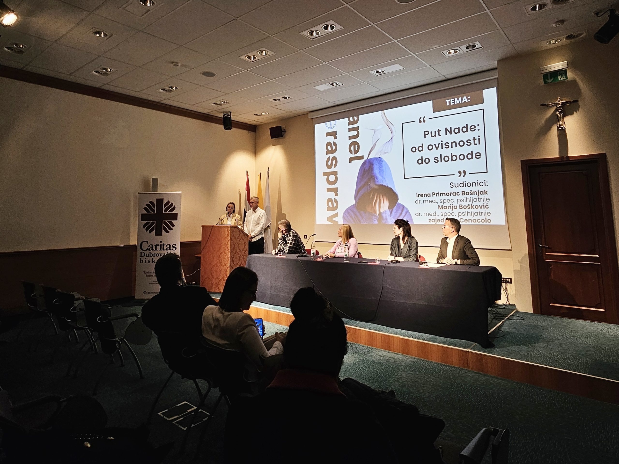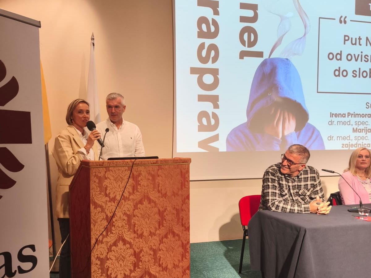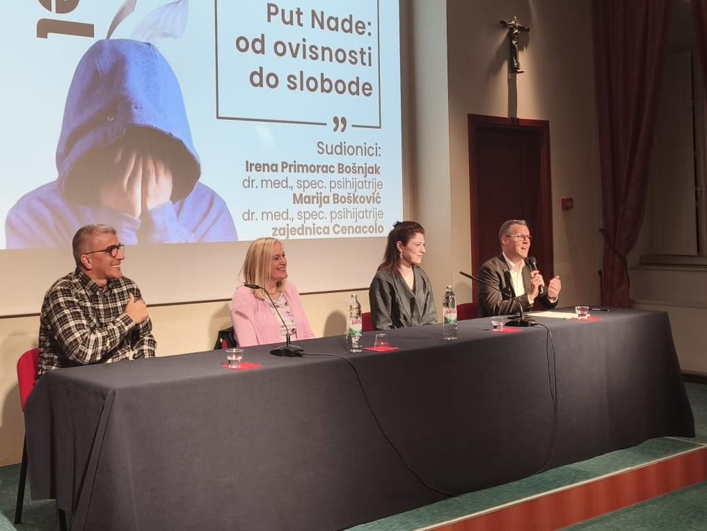 Panel rasprava na temu „Put Nade: od ovisnosti do slobode“ održana je u četvrtak 2. listopada u dvorani Ivana Pavla II. u Dubrovniku u Tjednu Caritasa Dubrovačke biskupije. Na panelu su sudjelovale dvije liječnice specijalistice psihijatrije, Irena Primorac Bošnjak iz Zavoda za javno zdravstvo Dubrovačko-neretvanske županije i Marija Bošković ispred dubrovačke podružnice Hrvatskog katoličkog liječničkog društva te predstavnici zajednice Cenacolo.