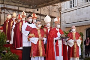 Biskupi i nadbiskupi koji su sudjelovali na slavlju 1050. obljetnice zaštite sv. Vlaha naizmjenično su nosili najljepšu relikviju moći glave sv. Vlaha. Relikviju Isusove pelenice i baldahin nosili su vjernici u narodnim nošnjama iz Konavala.