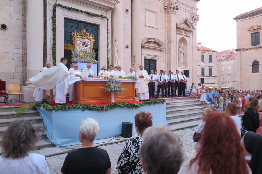 Veliki broj vjernika okupio se na večernjem pontifikalnom misnom slavlju koje je ispred dubrovačke katedrale na svetkovinu Uznesenja Marijina 15. kolovoza predvodio dubrovački biskup mons. Mate Uzinić u koncelebraciji više svećenika među kojima su bili kanonici Stolnog kaptola, redovnici s područja katedralne župe te katedralni župnik don Stanko Lasić. Na slavlju su sudjelovali i dubrovački bogoslovi i sjemeništarci kao i redovnice iz svih redova u biskupiji. Evanđelje je navijestio đakon don Tomislav Sikavica.