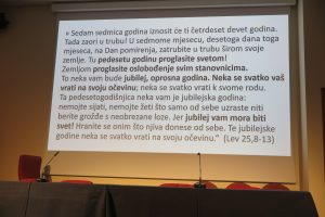 Kada Isus, kako je opisano u Novom zavjetu, nastupa u sinagogi on izriče proglas jubilarne godine, kazala je dr. Herman te nastavila detaljnije pojašnjavati stavke iz tog proglasa koje čovjeka istinski zarobljavaju u životu puno više nego razni materijalni dugovi. Crkva dugo nije slavila jubileje, nego je s tim počela 1300 godine. Predavačica je istaknula kako je posebnost slavljenja jubileja u Crkvi u tome što su oni kristocentrični, zatim su snažno eklezijalni jer skreću pozornost na jedinstvo putujuće, trpeće i slavne Crkve te su eshatološki usmjereni.