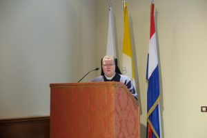 Isusovac p. Marijan Bešlić, dugogodišnji odgojitelj, župnik i pastoralac, govorio je o temi „Odgovor redovništva na izazove Crkve u današnjem svijetu“. Uvodno je podsjetio kako se Crkva na ovaj dan sjeća sv. Anđele Merici koja je utemeljila također jednu redovničku zajednicu, sestre uršulinke, te potaknuo okupljene redovnice i redovnike da se prisjete svih svojih utemeljitelja i pozvao ih „da tu karizmu pokušaju što dublje živjeti i svjedočiti u ovom vremenu“. Također je spomenuo Međunarodni dan sjećanja na žrtve holokausta, te potaknuo na molitvu na ovomjesečnu nakanu pape Franje.
