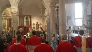 I eto nas uskoro u Blatu, rodnom mjestu „velike žene, Korčule cijele ponosa“, Marije Propetog Isusa Petković, utemeljiteljice Družbe Kćeri Milosrđa. Ta biblijski vrsna žena nije živjela čekajući od drugih podršku i oslonac, nego je, ostavivši bogatu kuću i imanje, otišla tamo gdje ju je, prepuštenu Providnosti, Bog odveo najmanjima od svih ljudi – napuštenima, siromašnima, bolesnima, neukima; ljubeći ih, liječeći i poučavajući, sa srcem majke prema djetetu. Marija je, poput Uzor Majke, Blažene Djevice Marije, bila izabrana duša koja je iz propetih Isusovih ruku dobila i dobivala nadahnuće i snagu za rad u posvemašnjoj ljubavi zbog Ljubavi koja se nastanila među nama, jer „živimo li ili umiremo, Kristovi smo“. U tom tonu i s vječnim pitanjem što znači biti svet i čista srca, te tko sam ja, jesam li spreman čuti i odazvati se Božjem glasu, nadahnuto je propovijedao don Šime uz predvoditelja slavlja don Krešimira. Svojim pjevanjem sv. misu uzveličao je katedralni zbor pod ravnanjem prof. Jelene Mikulandre i orguljašku pratnju Nikole Lovrića-Caparina, te uz prisuće mladih ministranata i članova Bratovštine sv. Jakova.