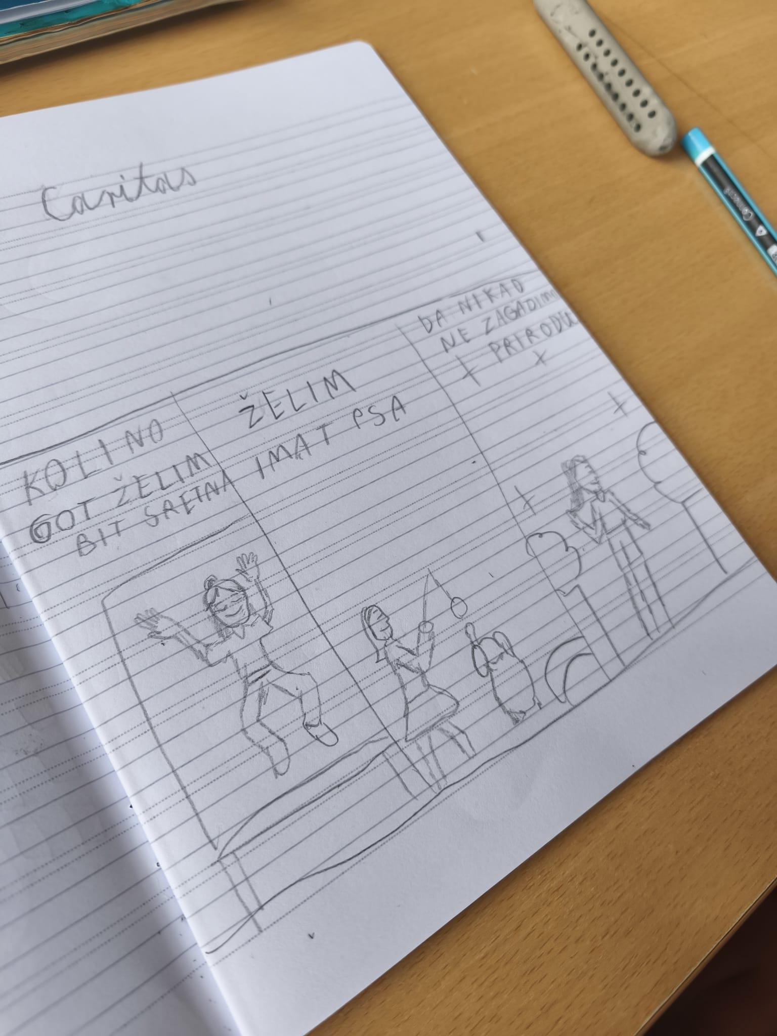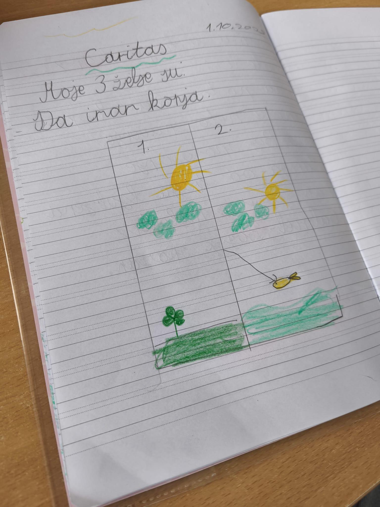 Učenici su potom u radionicama imali prigodu prepoznati svoje želje i uočiti koliko su ostvarive te osvijestiti da su najčešće sami, svojim trudom i upornošću, odgovorni za njihovo ispunjenje. Osnovne potrebe imaju i druge osobe, a neke ih možda ne mogu ostvariti, pa su tu dobri ljudi koji im mogu pomoći, naučili su učenici. Na satu su učenici također imali priliku postavljati pitanja, a zahvalnost Caritasovim djelatnicama izrazili su vjeroučitelji Božimir Previšić i Gabrijel Goreta.