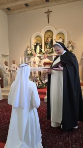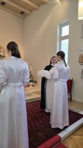 U svečanom obredu ulaska u novicijat vrhovna glavarica Vuco u ruke postulantica položila je habit, krunicu i bijeli veo koji su znak pripadanja dominikanskom redu. Također, udijelila im je i Konstitucije Kongregacije svetih Anđela čuvara kojima će ih poučavati učiteljica novicijata s. Blaženka Rudić. Kao simbol novog čovjeka i prepoznatljivosti u Redu, postulantice su izabrale i nova imena. Postulantica koja se u svijetu zvala Andrea Buzov u Redu se od sada zove s. Anđela, a postulantica Tena Pavlović postala je s. Veronika. Sestre, prema primjeru sv. Katarine Sijenske kojoj je u mističnoj viziji bilo ponuđeno izabrati između krune od cvijeća i trnove krune, izabiru trnovu krunu te im svakoj po jednu krunu učiteljica stavlja na glavu odnosno veo. Sestre trnove krune nose cijeli dan u znak izabiranja uvijek uskog, ali boljeg puta nasljedovanja Krista.