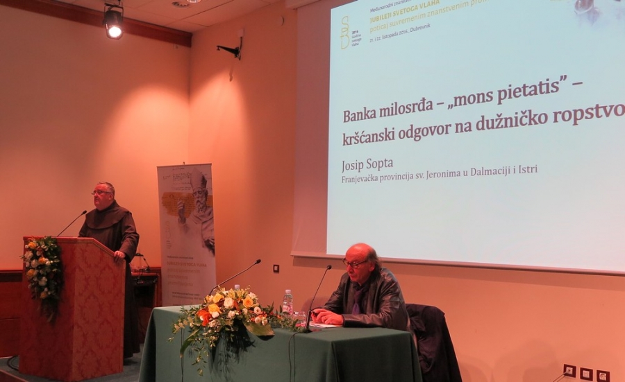 Dr. sc. fra Josip Sopta iz Franjevačke provincije sv. Jeronima za Dalmaciju i Istru govorio je o temi „Banka milosrđa –’mons pietatis’ – kršćanski odgovor na dužničko ropstvo“. Objasnio je da je riječ ‘mons’ u ovoj sintagmi povezana s hrpom, gomilom predmeta koji su se poslije prodavali da bi se dobiveni novac posudio s niskim kamatama potrebnim obrtnicima i srednjem sloju, što je bilo ‘pietatis’, djelo milosrđa u usporedbi s tada postojećom situacijom kada su židovski bankari davali kredite uz kamatu od 20-50%, te su ljudi upadali u dužničko ropstvo. Mons pietatis su nastale u franjevačkom redu među franjevcima opservantima u 15. stoljeću. Napomenuo je i kako je Stjepan Gradić nakon potresa 1667. godine osnovao svoju banku milosrđa koja se zvala „Mons di San Biagio“ te je i to pomoglo brzom oporavku Dubrovnika nakon Velike trešnje. Jeftinim kreditima tako je razbijena kraljica srednjeg vijeka – lihva, zaključio je predavač.